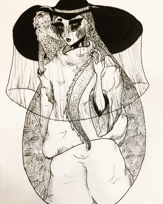 Pen and ink drawing of a witch and their familiar.